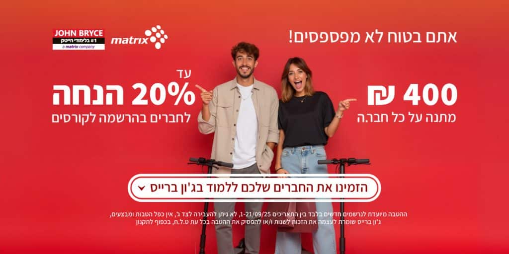 קבלת ההטבה מותנת ברישום חדש שאינו קיים במאגר הלקוחות של החברה ובהרשמה לקורס הסבה מלא בלבד | אין כפל הטבות ומבצעים | ג’ון ברייס שומרת לעצמה את הזכות לשנות ו/או להפסיק את ההטבה בכל עת | ט.ל.ח