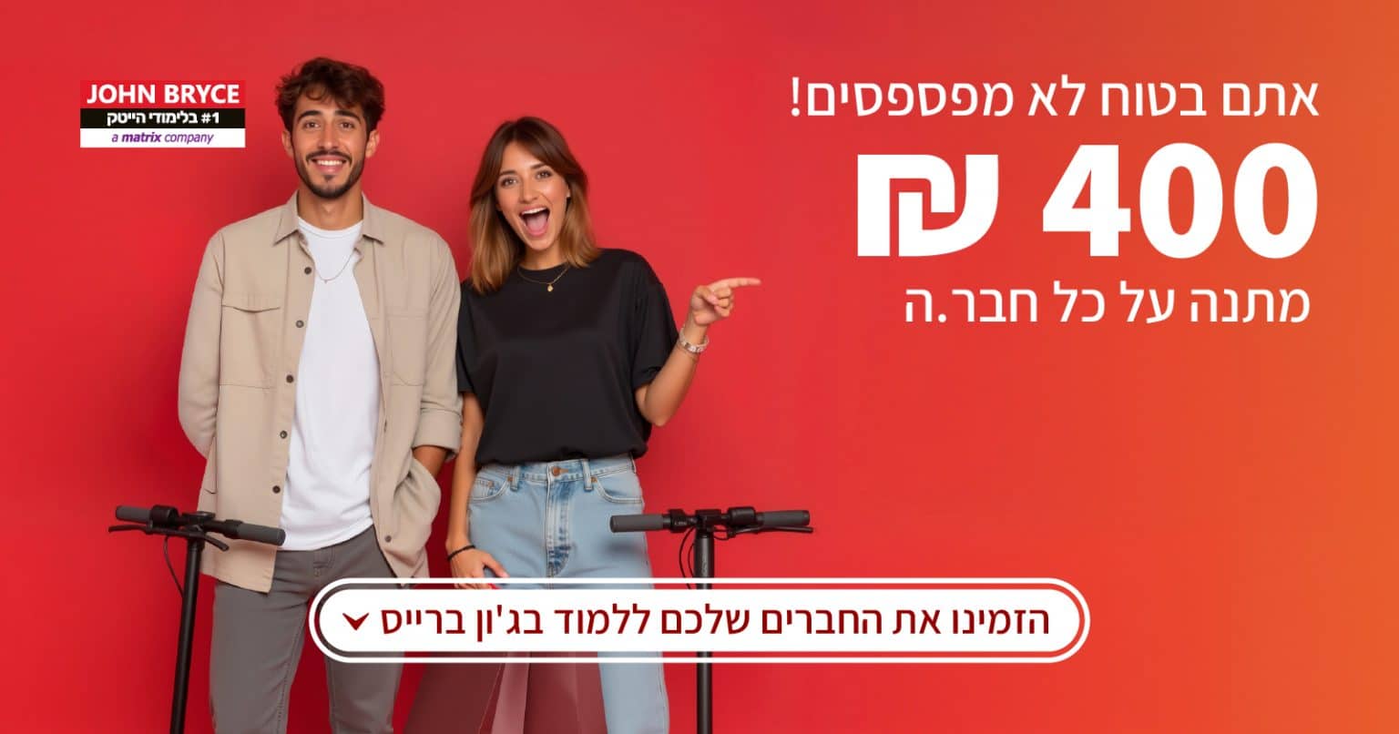 קבלת ההטבה מותנת ברישום חדש שאינו קיים במאגר הלקוחות של החברה ובהרשמה לקורס הסבה מלא בלבד | אין כפל הטבות ומבצעים | ג'ון ברייס שומרת לעצמה את הזכות לשנות ו/או להפסיק את ההטבה בכל עת | ט.ל.ח